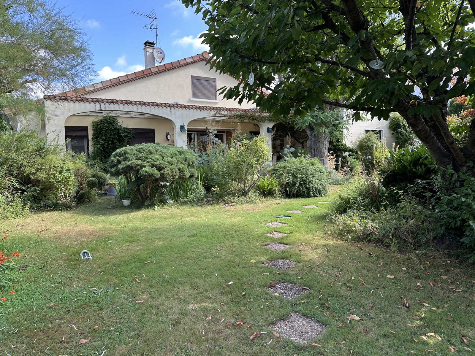 Au calme agréable maison de plain pied, 3 chambres plus bureau,salon avec cheminée, cuisine ouverte, salle de bain, salle d'eau, joli jardin de 1000 m2 arboré, garage.